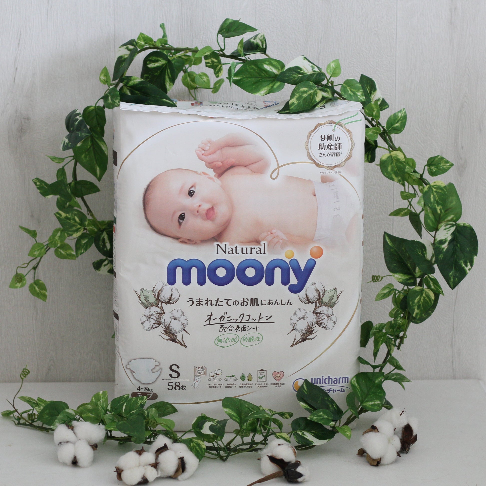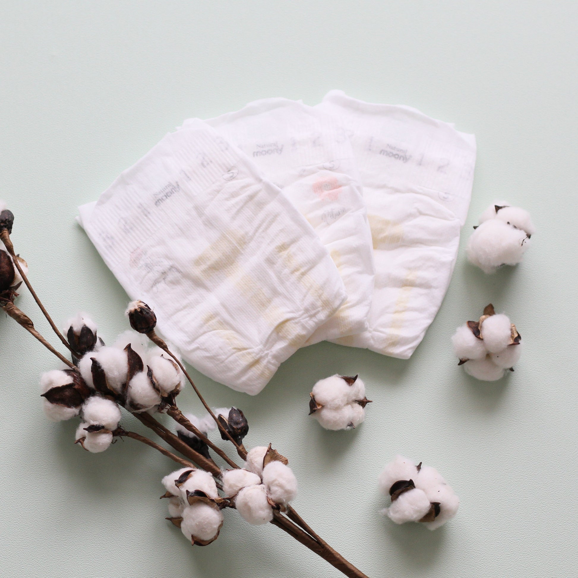 おむつは日本の最高品質のオーガニックコットン配合紙おむつ「ムーニー低刺激であんしん」を使用しています。