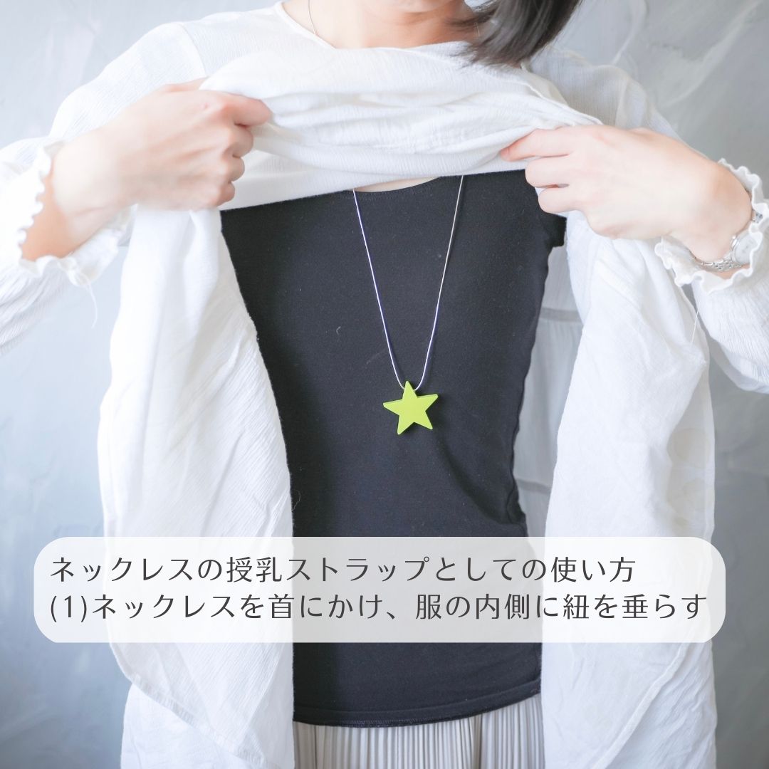 (1)ネックレスを首にかけ、服の内側に紐を垂らす。